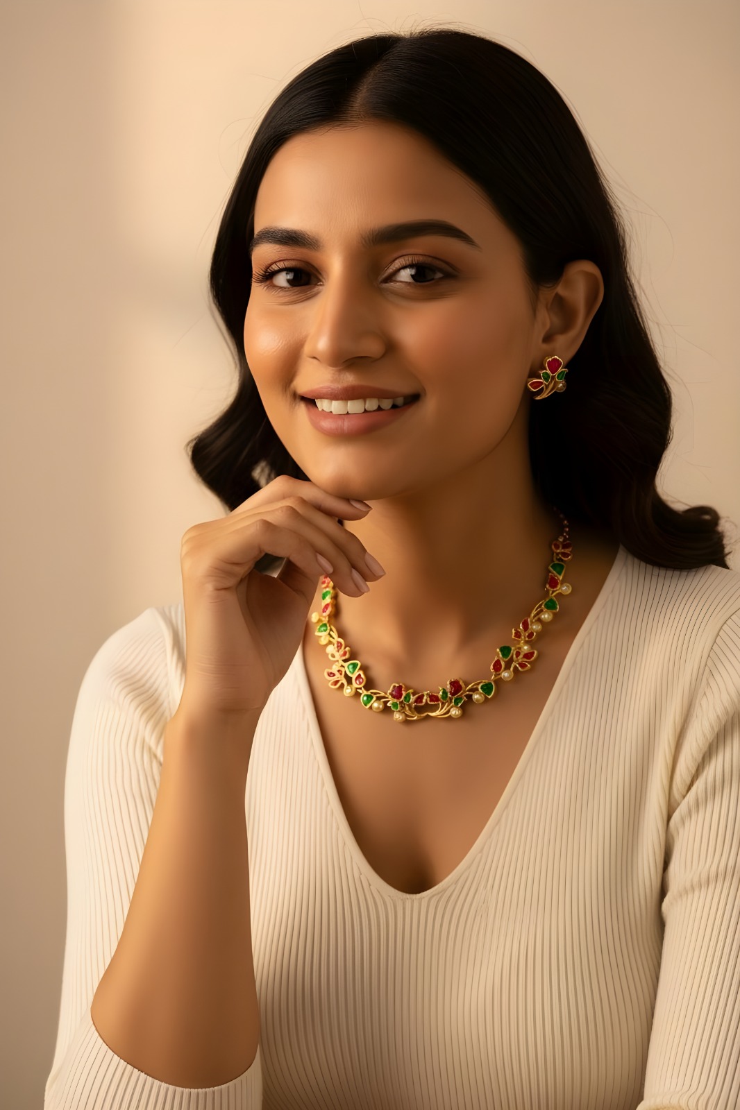 This stunning floral design gold-plated necklace set with matching earrings is crafted to add charm and elegance to your traditional attire. The necklace features delicate floral motifs with vibrant red and green stones, enhanced with pearl detailing for a touch of sophistication. The matching earrings complete the set, making it an ideal choice for weddings, festive occasions, or cultural celebrations. Whether paired with sarees, lehengas, or ethnic suits, this necklace set will elevate your style with grace and beauty.