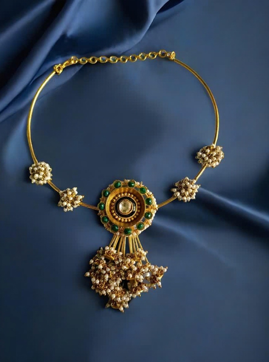 Crafted with precision and inspired by traditional Indian artistry, this gold plated necklace is a perfect blend of elegance and heritage. The centerpiece features radiant green stones surrounded by pearl clusters, creating a royal and graceful charm. Its versatile design makes it suitable for weddings, bridal wear, festive celebrations, or as a statement piece for special occasions.
