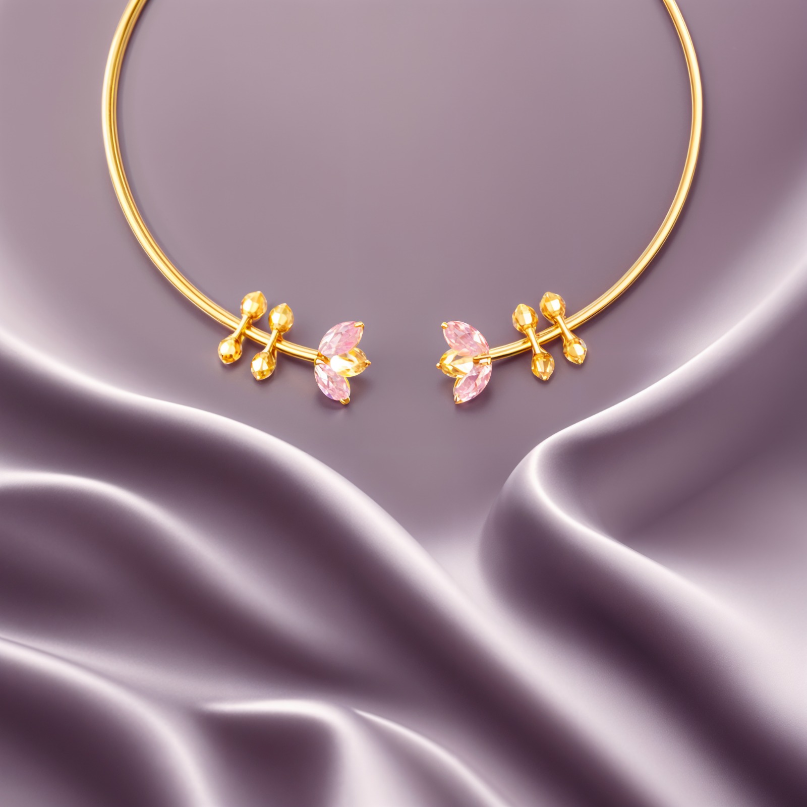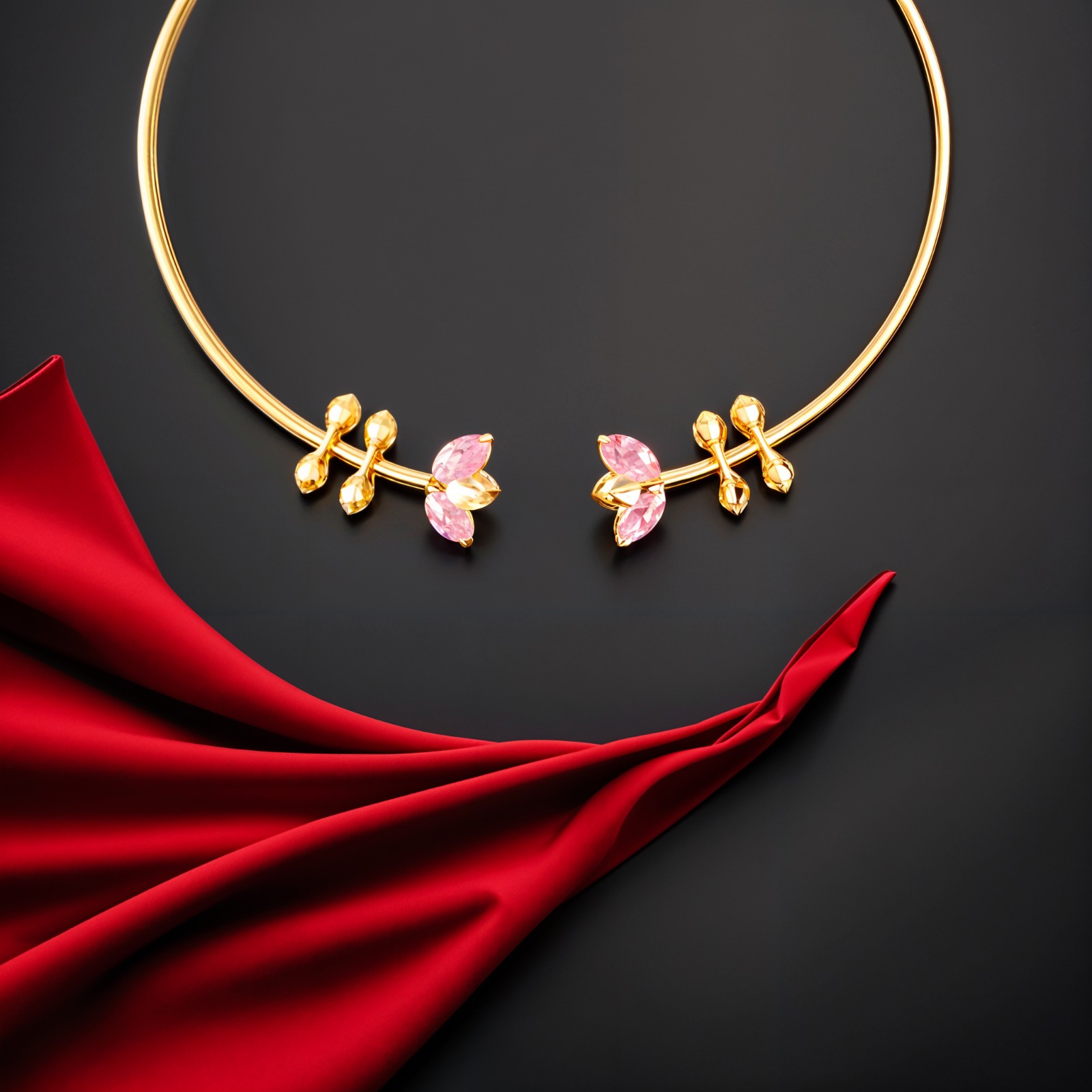 This Pink Crystal Floral Open Choker Necklace blends traditional elegance with contemporary charm. Crafted with a sleek gold-plated open band, it features twin floral motifs adorned with pink marquise-cut crystals and fine detailing. Lightweight and comfortable, this designer choker is ideal for weddings, parties, or evening outings. Its modern yet classic design allows it to be styled with sarees, gowns, or even chic western outfits, making it a must-have statement piece for your collection.